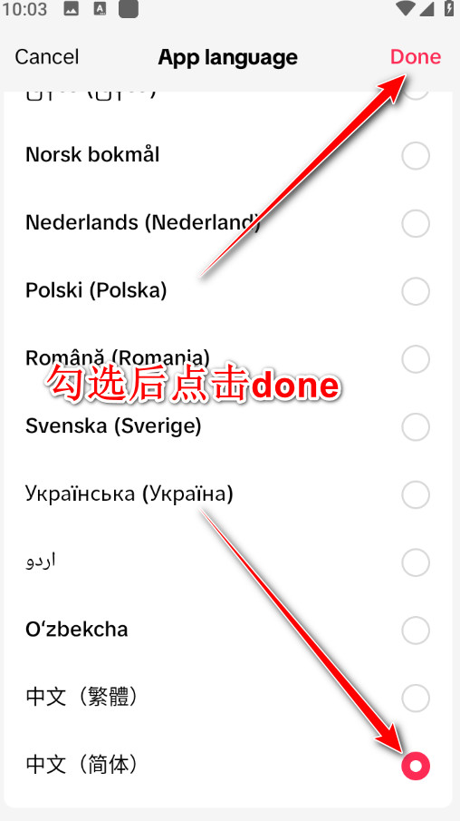 2、点击语言旁边的箭头。往下拉,中文在最下面,勾选圆圈。