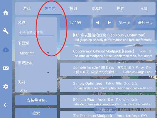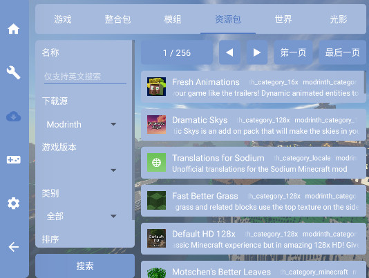 2、同样的就是模组下载,支持中文英文搜索,可以按下载源,游戏版本,类型等等进行挑选