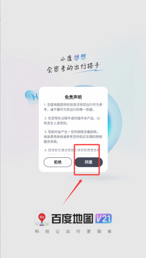 1、打开百度地图车机版app,首次使用需要【同意】免责声明;
