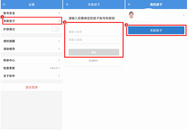 接着家长登录移动端APP,点击进入“我”-“设置”,点击“关联孩子”输入孩子的账号密码即可完成关联。重复此操作可以关联多个孩子。