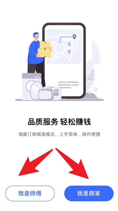 1、选择身份:首次进入App时可选择“我是师傅”或“我是商家”,确定身份后进入相应界面。