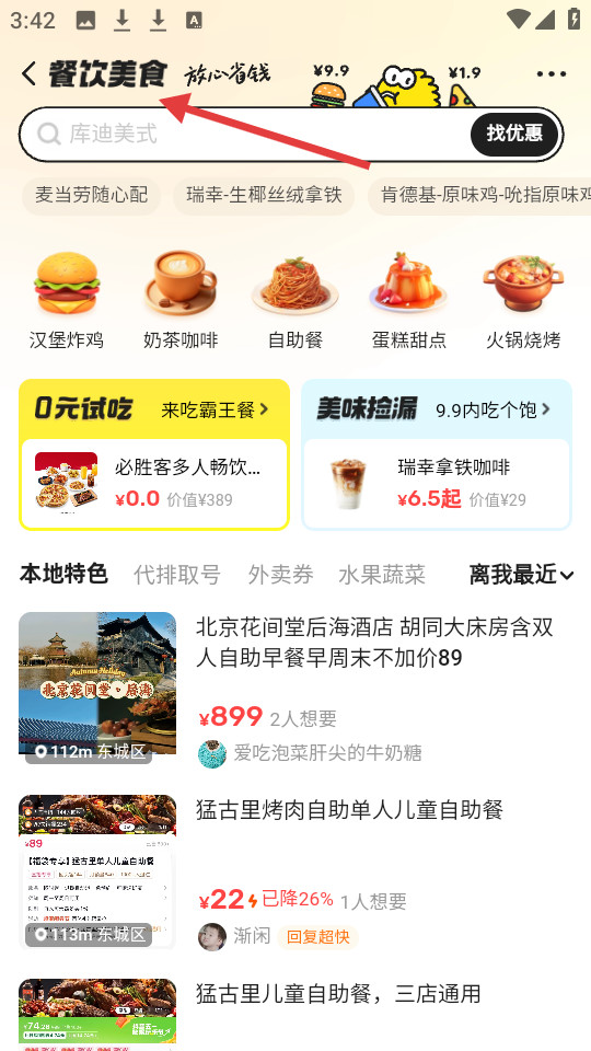 3、餐饮美食页能搜优惠,呈现麦当劳等品牌,按美食类别划分,展现众多本地餐饮优惠。