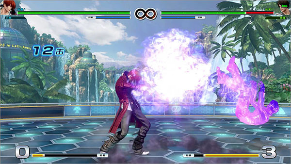 以对网络延迟有极高要求的格斗游戏拳皇14为例,无论是画面还是延迟都是很不错的,右上角可以看到延迟再 4ms 左右。