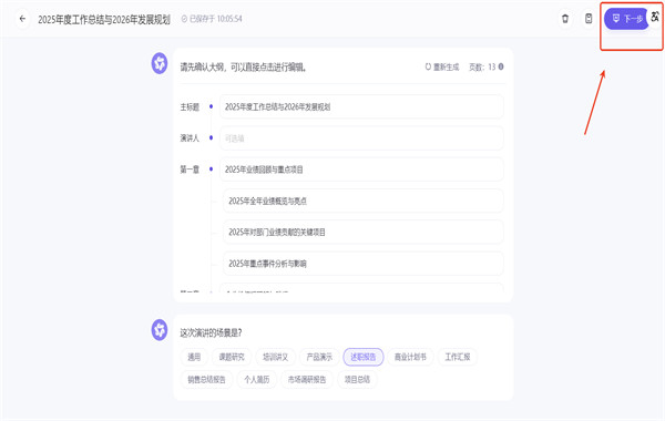 5.确认大纲后,点击右上角的下一步。