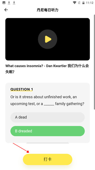 2、进入视频答题界面后,答完题之后,点击下方的“打卡”即可。