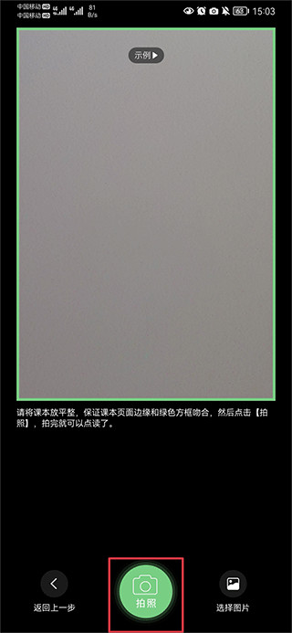 4、若里面没有你要的课本可以点击拍课本功能,然后将课本放平,保证课本页面边缘和绿色方框吻合,然后点击拍照就可以点读啦