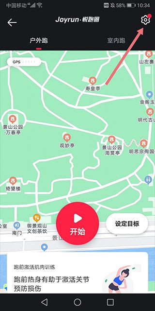 2、进入跑步记录页面中还可以点击右上角的【设置】图标(下图红色箭头所指区域)