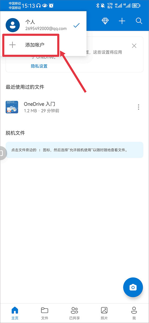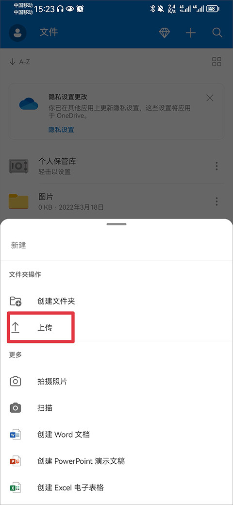 如果文件不适合于可用 OneDrive 存储空间,则无法上传该文件。 若要查看剩余空间或获取更多存储,请点击“菜单”>“设置”,然后点击帐户名称,查看总存储和可用存储空间。 或者,转到在线存储页面。