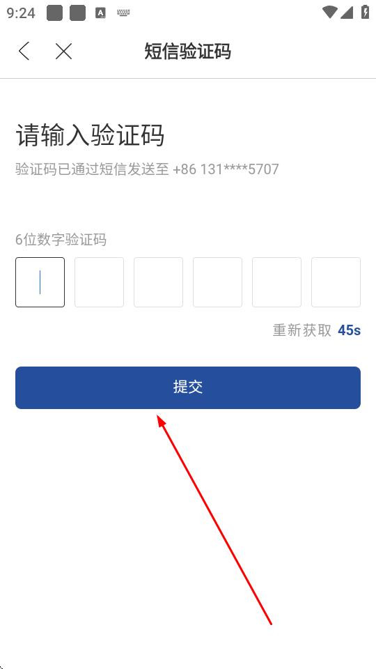5、进入短信验证码页面,输入收到的验证码后,点击提交。