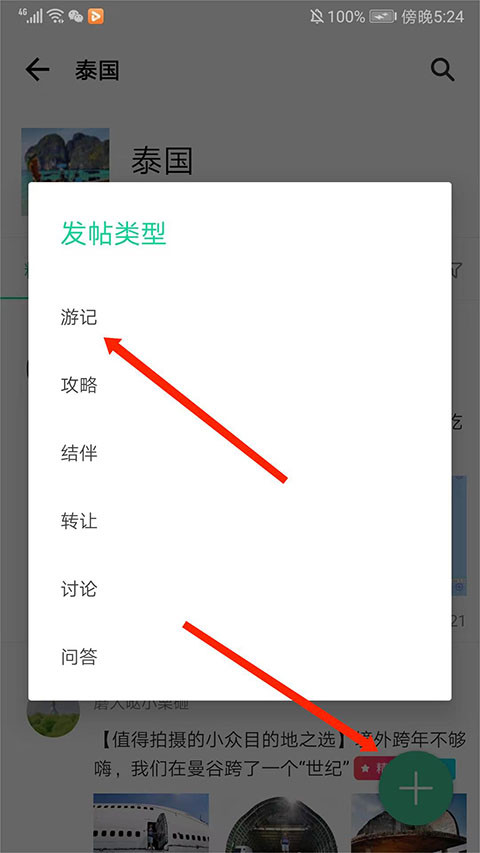 4、进入泰国板块,选择右下角“+”号图标,选择“游记”,选项,