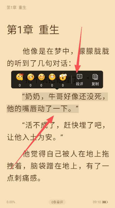 4、长按选中内容阅读文字部分,在弹出的段评功能中,选择发表。
