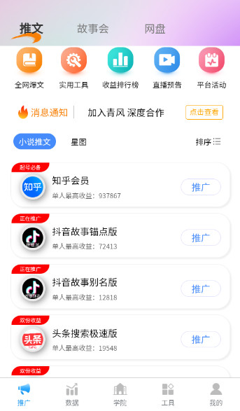 青风助手推文专注于文章与小说的推广需求,通过清爽直观的界面设计,让各项功能上手更快,大幅提升内容创作与分发效率。平台以创作者体验为核心,整合了丰富的推广素材与实用模板,支持图文、视频等多种形式灵活输出。青风助手(青风云创)推文官方正版下载后,用户可根据自身定位自由选择推广方案,更高效地触达目标受众,降低创作变现门槛,让内容价值得到更充分的释放。