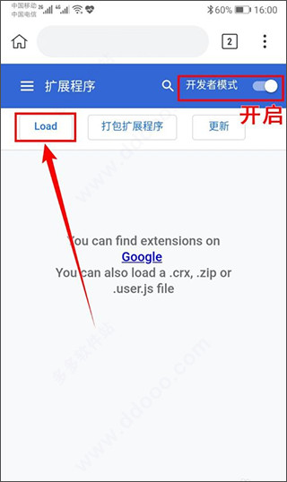 5、在打开的页面中,首先开启【开发者模式】,然后点击【Load】按钮。