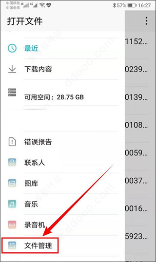 8、在弹出的“打开文件”侧边栏中,选择【文件管理】。