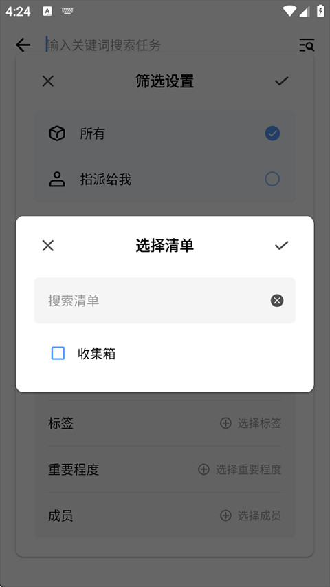 在清单选择窗口顶部输入关键词,可快速定位目标清单,避免海量任务造成混乱。