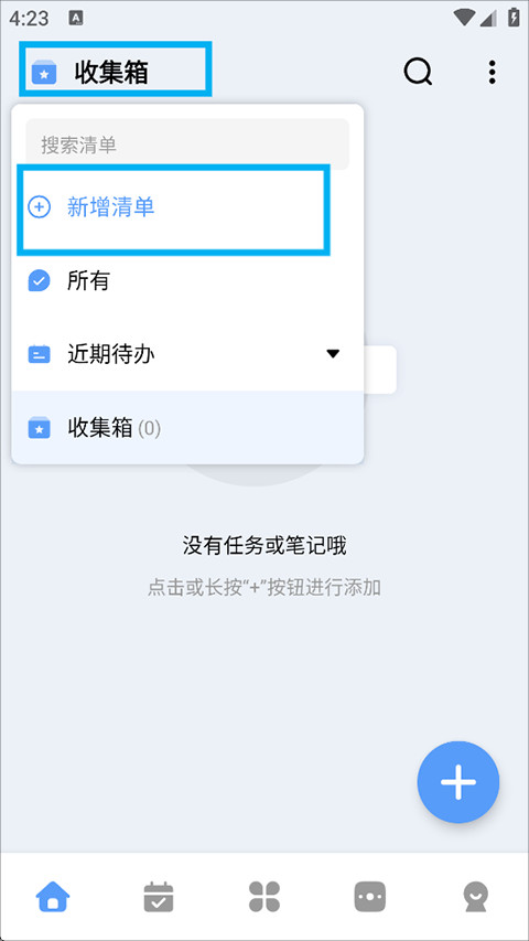 点击首页左上角图标打开清单页,选择新增,输入名称即可创建新清单并开始使用。