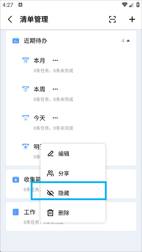 完成不再使用的清单可隐藏,需恢复时下拉管理页面即可重新显示清单。