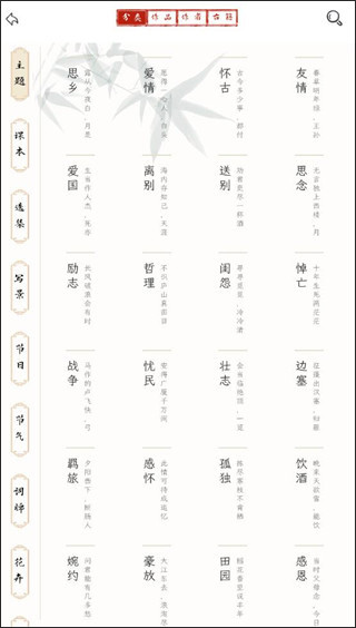 书阁细分主题、节日、写景等,多层次收录小学至高中课本诗词。