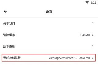 在这里便可看到版本更新以及游戏的存储路径,此前玩家下载的所有游戏都将被保存到:/storage/emulated/0/PonyEmu中
