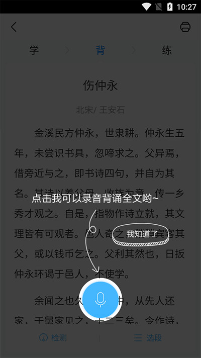 选定课文后进入背诵模式,实时录音并识别已背内容,便于纠正错误。