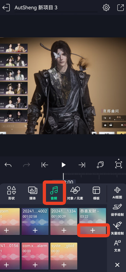 3、插入音频就选择【音频】,会出现你手机内所有的音频文件。点击音频文件下面的+号就能导入了。