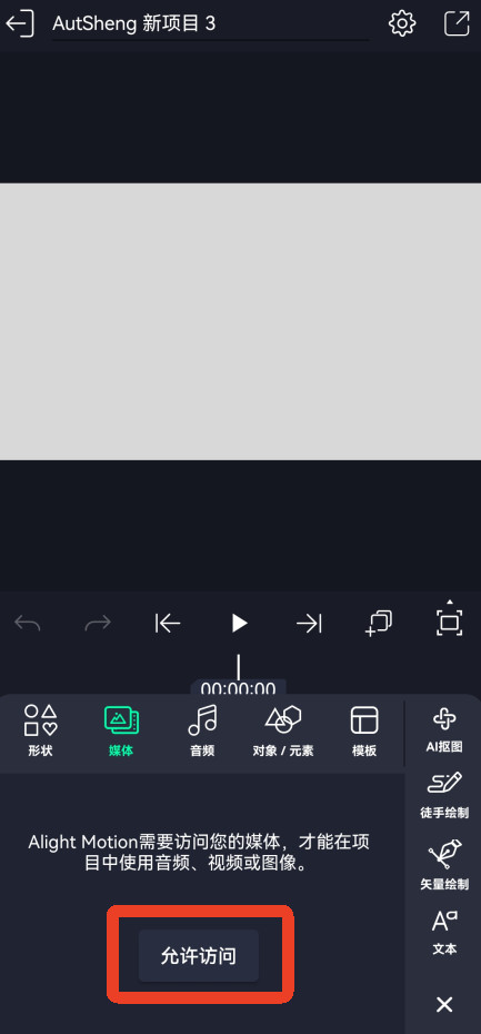 2、点击第二个媒体,需要允许AutSheng官方版访问我们的文件,点击【允许访问】,没有反应的话自行去设置里的权限管理开启权限。先导入一张图片。