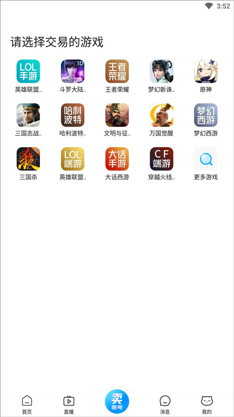 2、选择要交易的游戏,包括英雄联盟、王者荣耀、原神、穿越火线等;