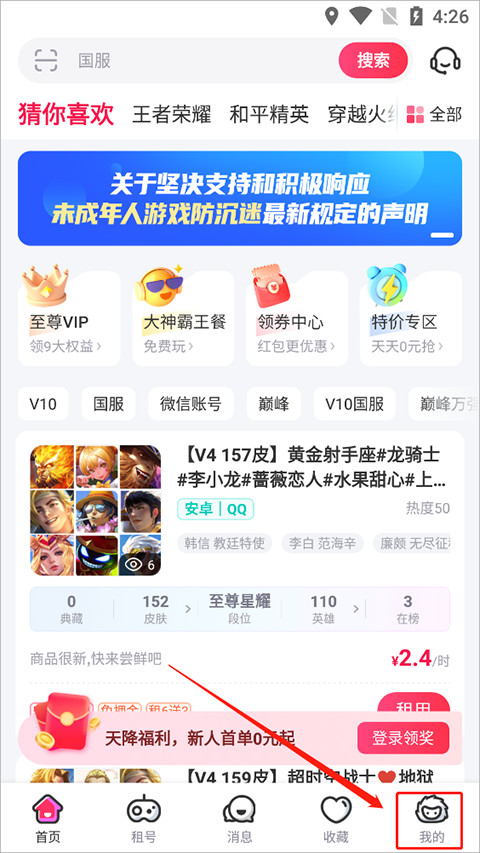 1、首先登陆租号玩app,点击右下角的【我的】来进入个人界面。