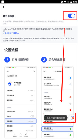 1、小米、vivo手机需先在系统中打开大学搜题酱悬浮窗权限后,再打开本页面中的开启悬浮窗按钮。