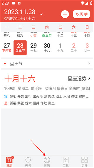 1、打开软件后,选择导航栏的黄历模块,进入主界面