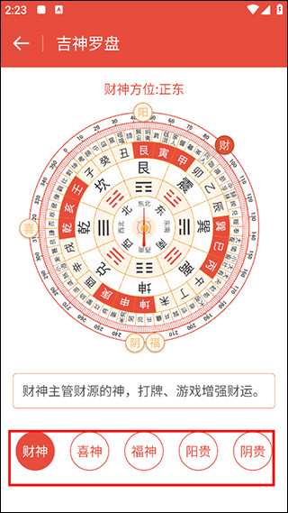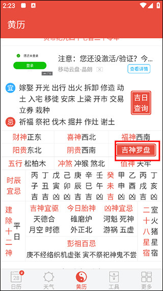 2、在黄历页面找到吉神罗盘,点击即可查看详细内容