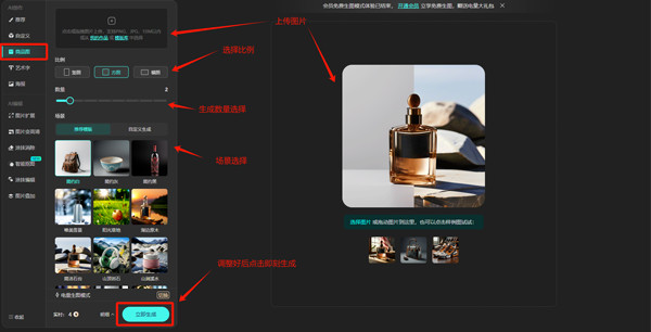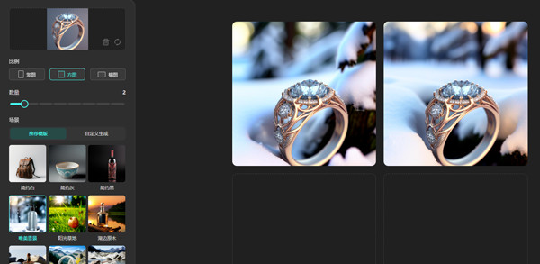根据提示进行编辑可得到完整的商品图(这里是使用了模板中的唯美雪景场景,这里比较建议各位朋友还是输入详细的提示词去生成场景)