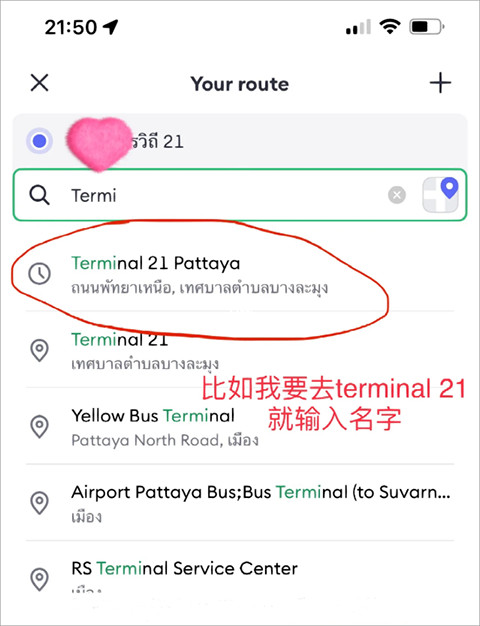 2、假如你要去Terminal 21,只需输入地点名称即可轻松选择。