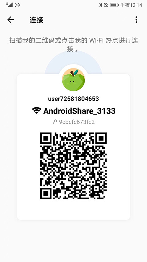 2、如图,已经生成了二维码,发送方通过扫描接收方的二维码或者点击wifi热点进行连接,