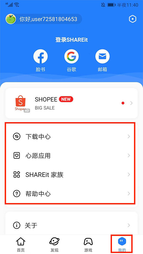 7、在我的界面,包括下载中心、心愿应用、SHAREit家族和帮助中心等选项,用户可根据需求选择使用,包括查看下载的文件和查看帮助,以上就是茄子快传的使用方法了。
