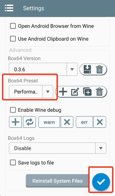 4、这里面基本上大部分都不需要更改,主要就是改Box64的预设,比如改成性能,改完之后记得点击右下角√保存。