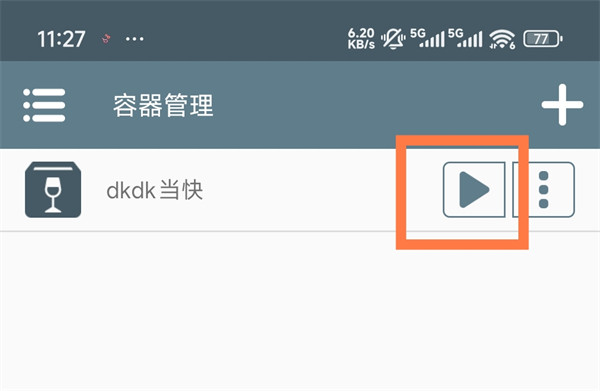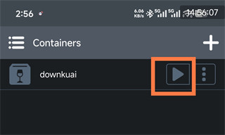 6、返回到主页,找到刚创建的“downkuai”容器,点击右侧的播放按钮启动容器。