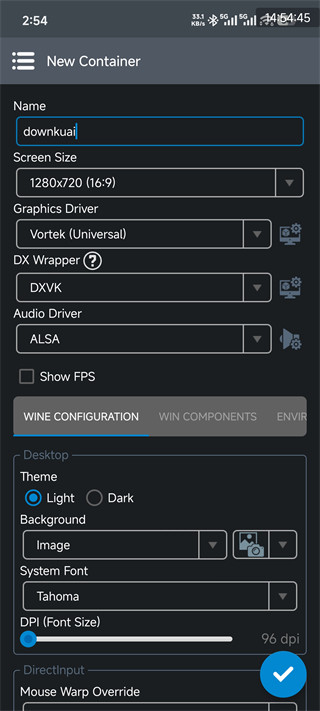 2、在NewContainer页面填写容器名称,按需设置屏幕尺寸、图形驱动等基础参数,完成基础配置。