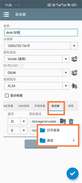 5、回到容器配置页,设置好游戏挂载的磁盘盘符与路径后,点击右下角的√完成容器创建。