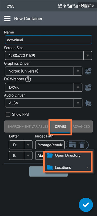 3、切换到DRIVES选项卡,点击路径选择按钮,选择OpenDirectory或Locations来定位游戏文件所在目录。
