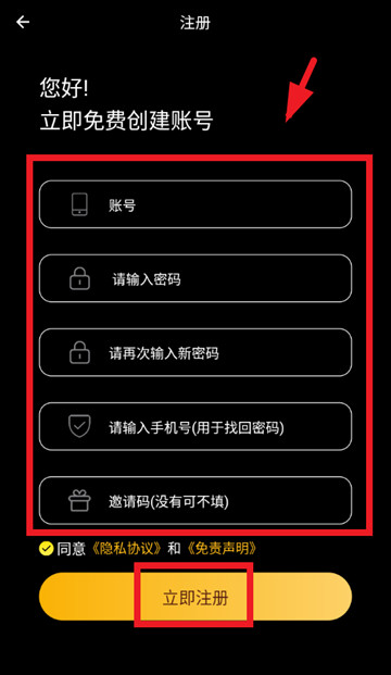 输入账号,密码,手机号等,点击立即注册即可