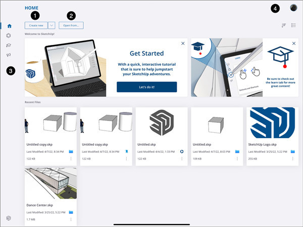 主屏幕是您在启动并登录到草图大师中文版后首先看到的内容,其中包含以下内容: